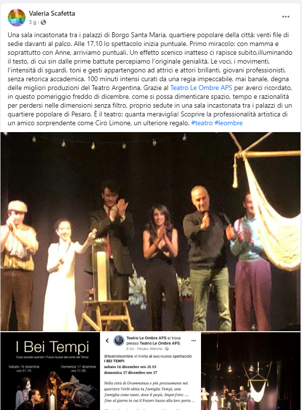 Il Teatro Le Ombre, con questa nuova produzione, conferma la sua vocazione educativa alle arti, in particolare al teatro delle nuove generazioni, portando in scena gli attori più giovani della sua compagnia. Allievi che hanno iniziato ad affrontare pubblico e palcoscenico in tenera età e che oggi affrontano un testo teatrale di un autore contemporaneo.