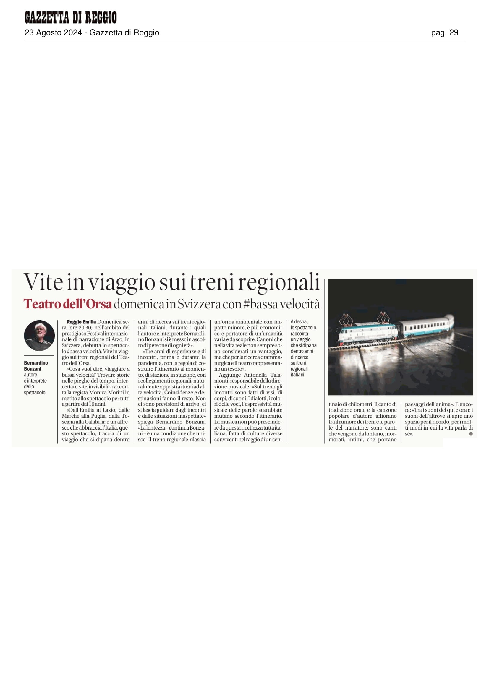 L’autore interprete Bernardino Bonzani ha costruito lo spettacolo raccogliendo, nell’arco di molti mesi, storie di persone incontrate durante lunghi viaggi sui treni regionali in tutta Italia.