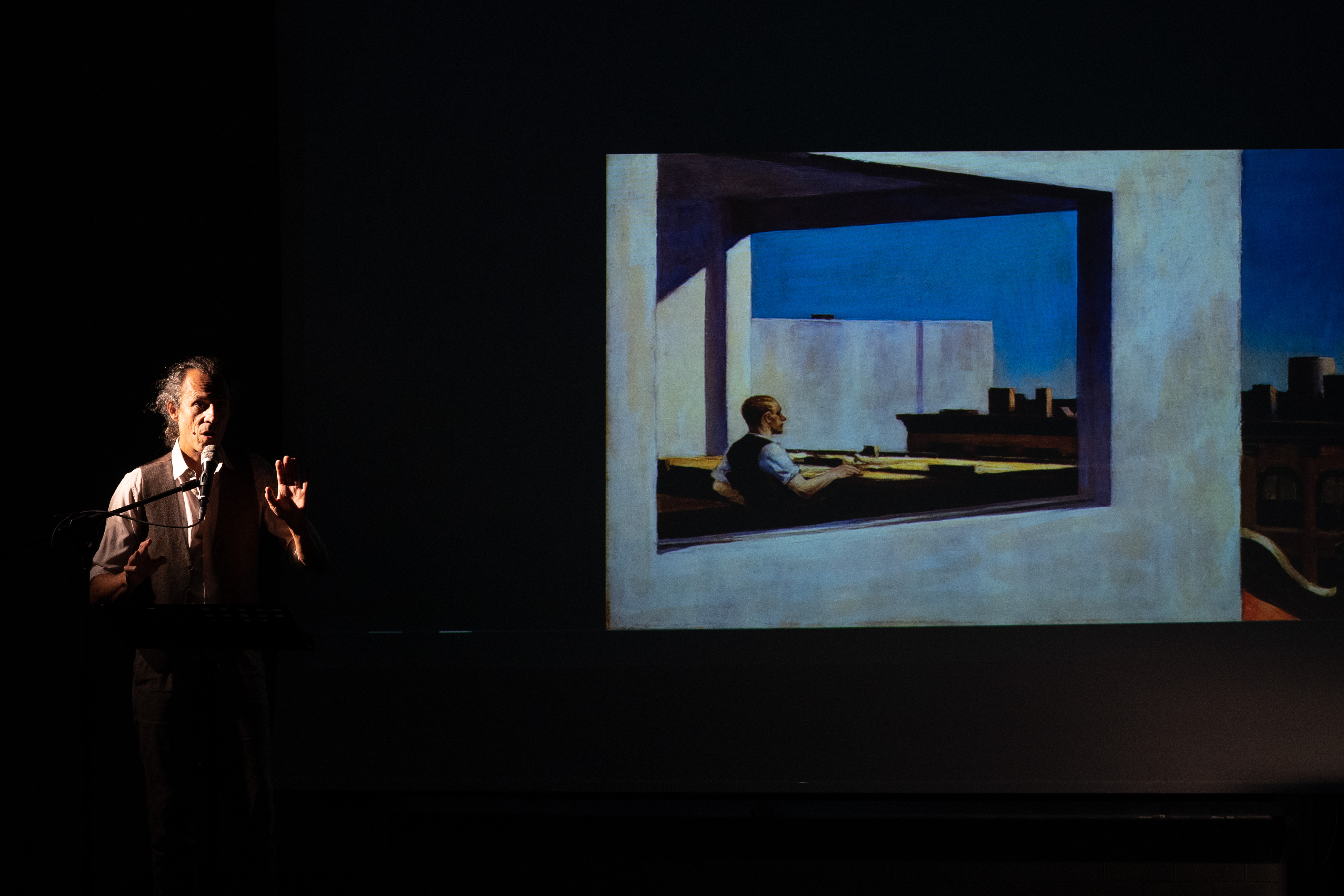 I testi, ispirati dalle opere di E. Hopper (Automat, 1927; Office in a small city,1953; Morning sun, 1952; Apartment Houses, 1923), ne condividono la sospensione e l’attesa. Una partitura per corpi e voci che hanno il lavoro come tarlo (lo hanno perso ma soprattutto lo cercano) e la precarietà come destino. In questa corsa truccata, per acciuffare il “codino”, per appropriarsi di un ruolo che conferisca solidità a identità instabili per natura, ci sono step, passaggi, livelli, come in un video game. Il primo e più fatale di questi “momenti della verità” è il “colloquio”. Tutti si imbattono prima o poi nella Selezionatrice, che un po’ come la democrazia di questi tempi, si dà per scontata ma a volte addirittura non c’è.