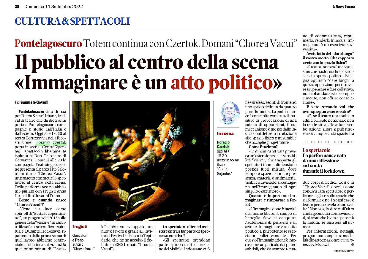 Chorea Vacui nasce nel 2021 come spin-off di "Bestiale Copernicana", lavoro del 2013, sviluppato in residenza presso il PAN Palazzo delle Arti di Napoli; R.E.D. Residency Eina Danz - Eina, Oslo (NOR); Trasparenze festival e residenze - Modena. Chorea Vacui è stato programmato per: FIT Fosca in tepidario Festival - Firenze; Bologna, Teatri di Vita, resiDANZE Festival; Festival Risveglio di Periferia - Milano; Cortile Teatro Festival - Messina; TOTEM Scene Urbane - Ferrara; Codex Festival - Noto (SR); Casa Gesualdi | Trono - Napoli; Spazio Azul - Viareggio; Periferico Festival - Modena.