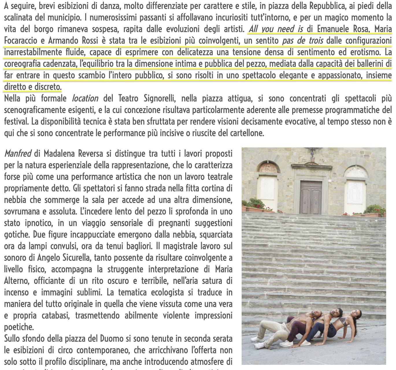 Partendo da figure di alcuni balli di coppia tradizionali quali il tango, il valzer, la salsa... "all you need is" intende esplorare e mettere in discussione la logica delle opposizioni binarie che dominano il nostro sistema di pensiero, la nostra cultura e la nostra società attraverso l’intromissione di un terzo elemento “nella relazione”. Sulle note di una famosa composizione di John Surman, una danza a tre fatta di continui incastri, equilibri e interconnessione fisica prende forma, come metafora di una diversa costellazione di relazione. Di che cosa si ha bisogno per continuare a coesistere in una relazione tra più di due elementi? Com'è possibile trovare e mantenere l'equilibrio ed il ritmo tra tutti? A quale costo?